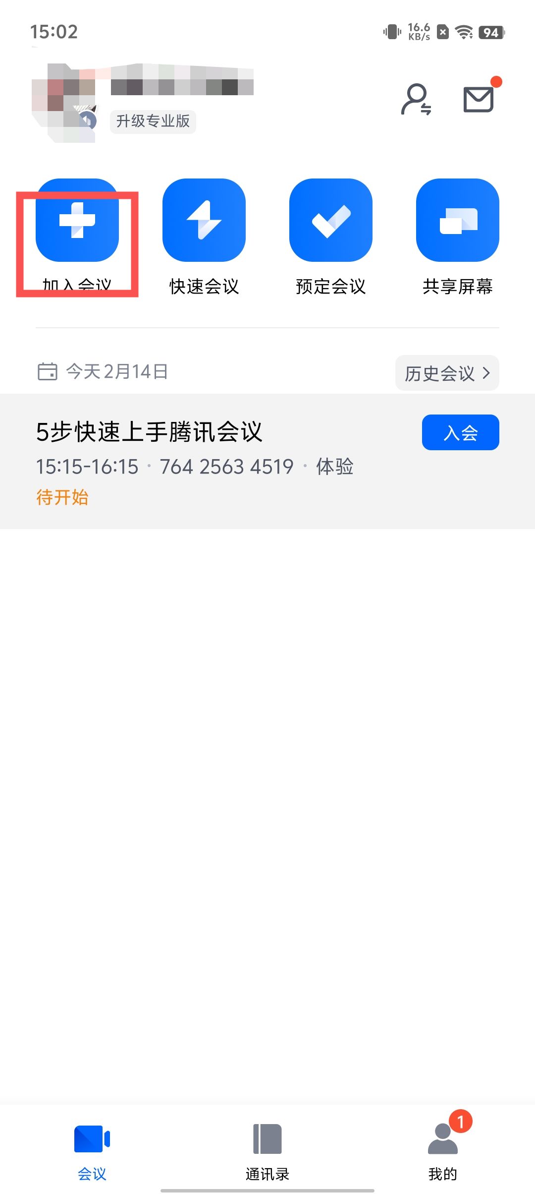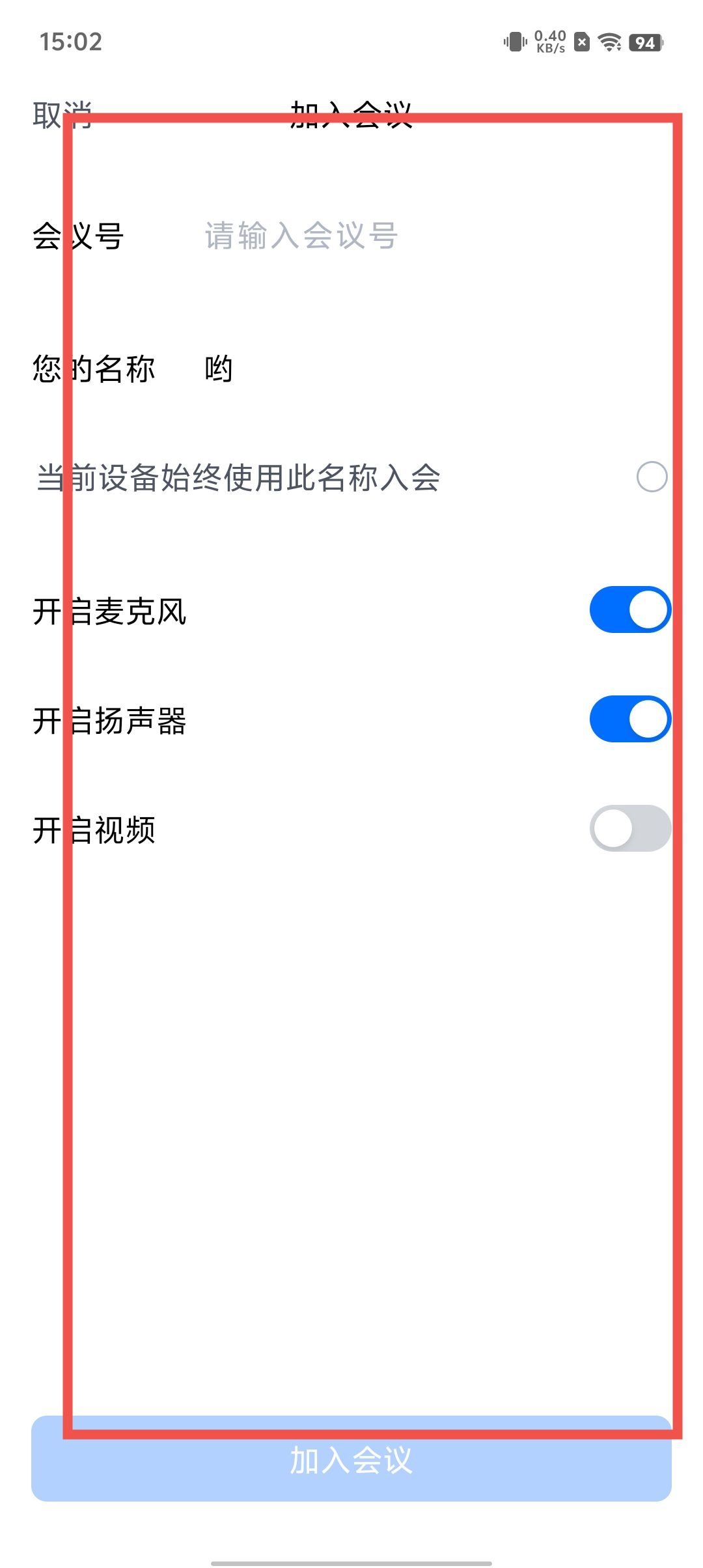 第二步,输入会议号,编辑名称,选择开启麦克风,扬声器,视频就可以加入会议。