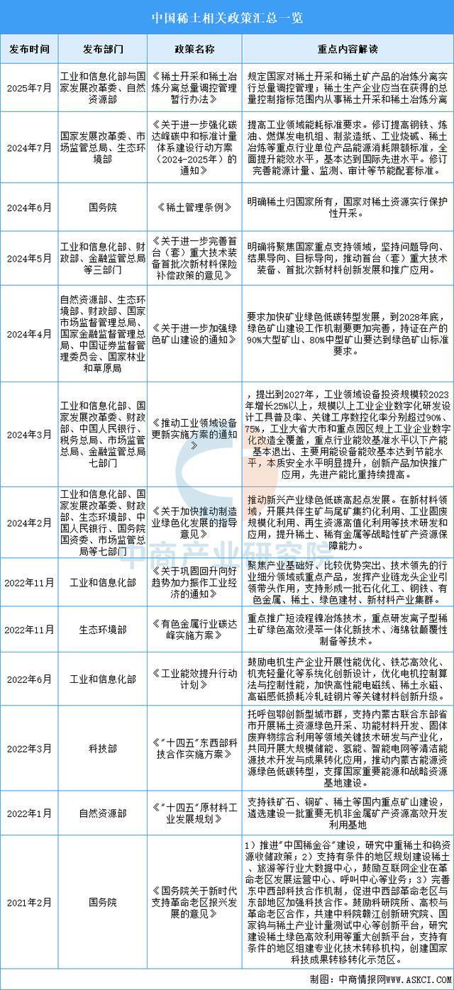 近年来,中国稀土行业受到各级政府的高度重视和国家产业政策的重点支持。国家陆续出台了多项政策,鼓励稀土行业发展与创新,《稀土开采和稀土冶炼分离总量调控管理暂行办法》《关于进一步强化碳达峰碳中和标准计量体系建设行动方案(2024-2025年)的通知》《稀土管理条例》等产业政策为稀土行业的发展提供了明确、广阔的市场前景,为企业提供了良好的生产经营环境。具体情况列示如下:
