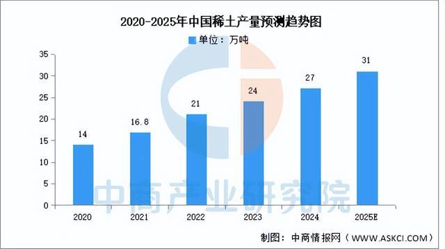 在稀土产量方面,中国占据主导地位。中商产业研究院发布的《2025-2030年中国稀土行业市场发展前景研究报告》显示,2024年我国稀土产量为27万吨,同比增长12.5%。中商产业研究院分析师预测,中国稀土产量将超过30万吨。