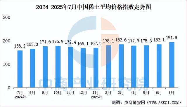 2025年7月,稀土价格指数呈上涨趋势。本月平均价格指数为191.9点。价格指数最高为7月30日的205.4点,最低为7月1日的182.0点。高低点相差23.4点,波动幅度约为12.2%。