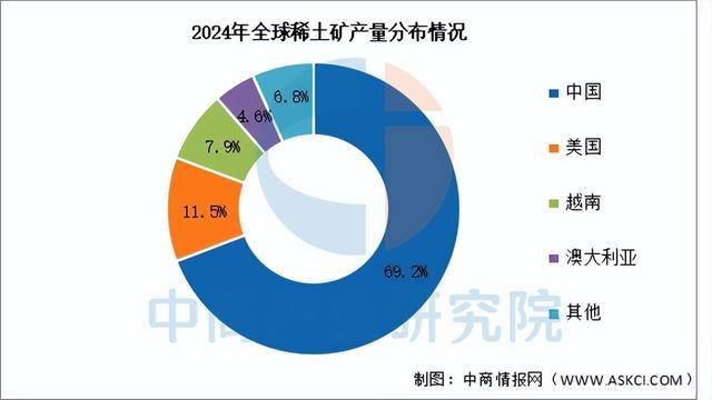 2024年全球稀土矿产量达39万吨,中国占比69.2%,排名第一。美国位居第二,占比达11.5%。越南、澳大利亚占比分别为7.9%和4.6%。