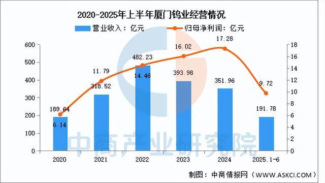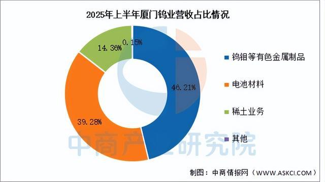 2025年上半年实现营业收入191.78亿元,同比增长11.75%;实现归母净利润9.72亿元,同比下降4.42%。2024年主营产品包括钨钼等有色金属制品、电池材料、稀土业务,营收分别占整体的46.21%、39.28%、14.36%。