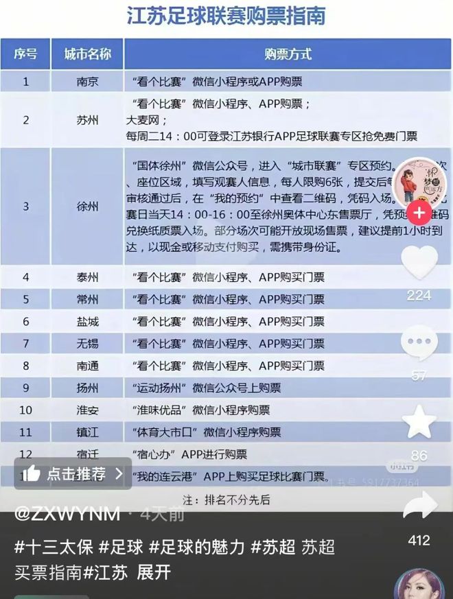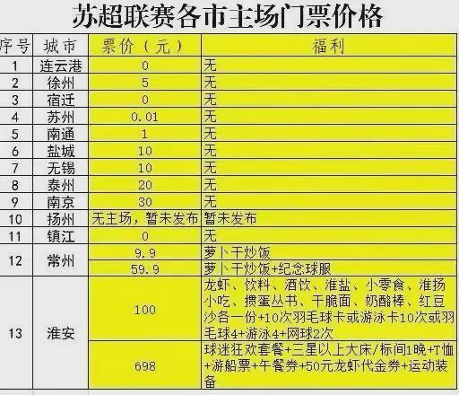 其次,每个球队的票价也是自行决定的。第二轮起,部分球队继续保持免费,南京把价格提到30元,徐州、盐城、无锡和泰州分别提至5元、10元和20元,这些都在合理之中。苏州是最懂得抓眼球的,门票售价0.01元。淮安则是深谙江浙沪致富之道,最先把比赛给玩明白了,推出了100元和698元的游玩套餐,吃的,玩的,看的,住的,高性价比的和轻奢的,供你选择。