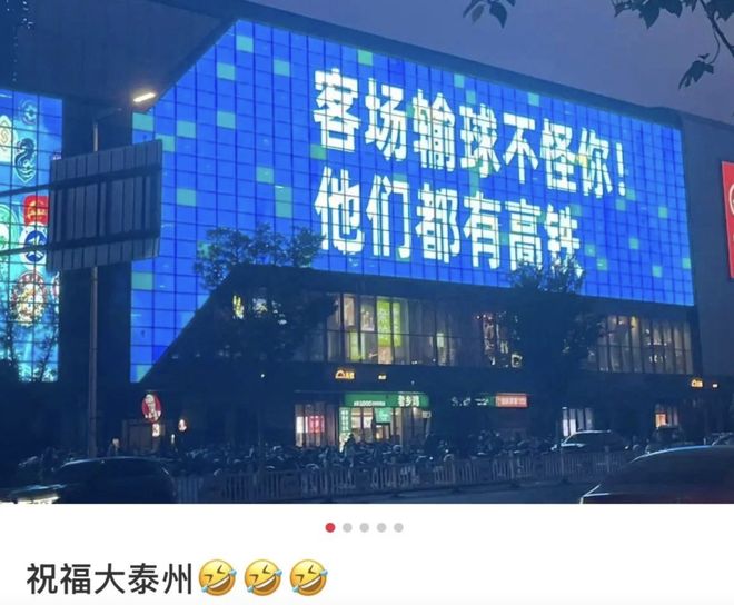 泰州首轮2-0赢下无锡队,第二轮0-3不敌盐城,泰州天虹购物中心打出安慰语,“客场输球不怪你,他们都有高铁”。
