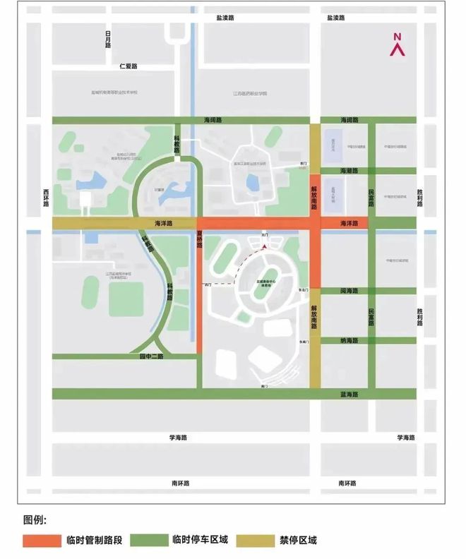 场馆周边道路设置9处临时停车区域,具体包括:海阔路(西环路至胜利路)、海潮路(解放路至胜利路)、科教路(海阔路至园中二路)、海洋路(解放路至胜利路)、园中二路(西环路至夏桥路)、蓝海路(西环路至胜利路)T型停放、阅海路(解放南路至胜利路)、纳海路(解放南路至胜利路)、民富路(海阔路至蓝海路),车辆可沿以上路段机动车道单排顺向停放。