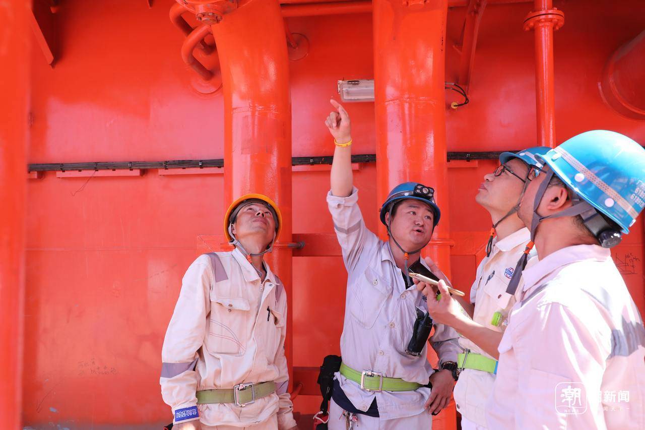 高端船舶建造师们在讨论施工细节,为穿梭邮轮试航、交付做准备。潮新闻记者 吴越 摄