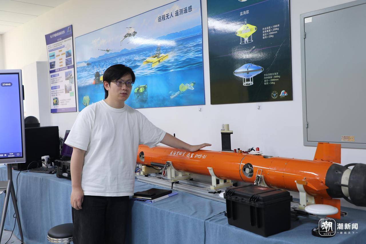 “海底寻宝”背后,离不开海洋机器人的助力。“机器人携带传感器,我们称之为‘嗅觉’。”产斯瑜指着一个橙色鱼雷形机器人介绍,该款无人无缆型自主水下机器人可以实时获取羽流流场和化学信号并进行路线规划,实现热液羽流的搜索、追踪和定位。